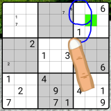 With this input method you first select a cell by tapping on it with your finger and then you use the numeric pad at the bottom of the screen to enter one or more possible values for that cell. The selected cell will be highlighted with a background color.